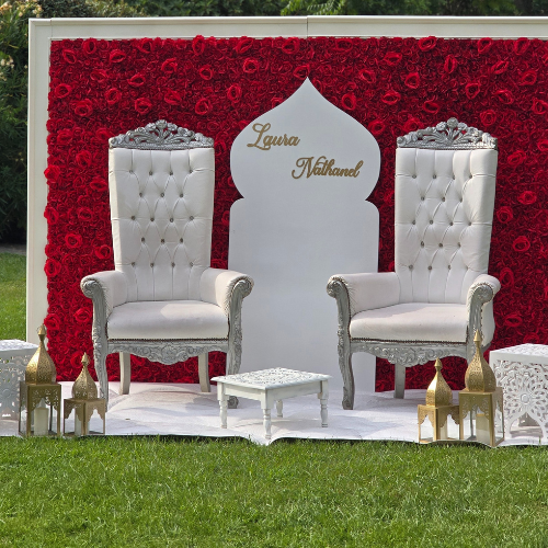 Le fauteuil au choix constitue l’une des pièces centrales de cette scénographie. Confortable et esthétique, il est sélectionné pour offrir un équilibre parfait entre tradition, modernité et élégance. Le fauteuil devient le trône sur lequel la mariée s’installe durant le rituel, un élément essentiel pour les photos et vidéos. Il peut être classique, oriental, chic, moderne ou bohème selon vos préférences. Choisir le fauteuil fait partie de l’expérience personnalisée que nous souhaitons offrir afin de créer un décor qui correspond réellement à votre vision.