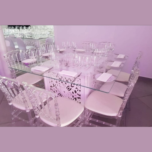 Le plateau en verre renforce l’aspect pratique de la table. Le verre est robuste, facile à nettoyer et parfaitement adapté aux usages intensifs. Pour les organisateurs, cela signifie une préparation plus rapide, moins de contraintes techniques et une surface immédiatement exploitable pour la vaisselle, les éléments décoratifs, les présentoirs traiteur ou les supports marketing. Ce plateau transparent permet aussi à la lumière de se diffuser plus librement dans l’espace, ce qui contribue à un rendu visuel cohérent dans les configurations nécessitant des jeux de lumière.