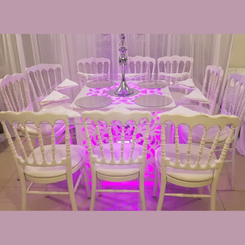 La table arabesque lumineuse est un mobilier conçu pour offrir une solution pratique, moderne et adaptable à tous vos événements. Avec son pied blanc en forme d’arabesque et son plateau en verre, elle s’intègre facilement dans différents types d’aménagements. Elle peut accueillir 8 à 10 personnes, ce qui en fait une option fiable pour structurer les zones de repas ou créer un espace central lors de réceptions. Grâce à son éclairage personnalisable, elle devient un élément polyvalent pour toute location mobilier pour évènement.